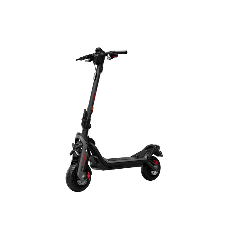 Segway GT3 E. Sospensione anteriore idraulica e posteriore a bracci oscillanti, autonom. fino 95 km. Pneumatici larghi da 11”. Doppio freno a disco con ABS, TCS, IPX6, Apple Find My, sblocco a distanza, display connesso, carica veloce. Pot. max 2400W, peso 39,5 kg. Carico 150 kg, v.max 25 km/h.